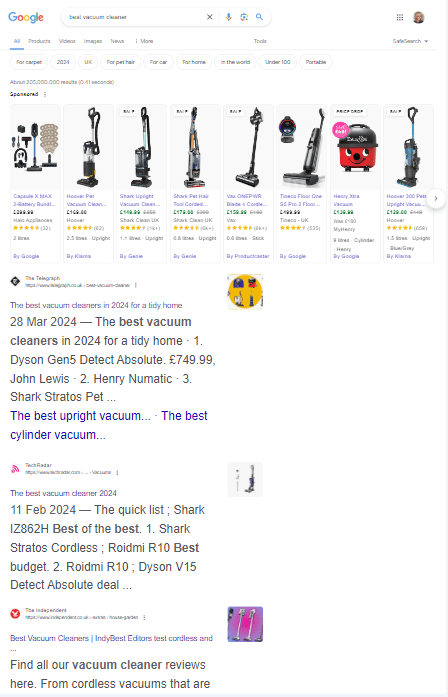 For online businesses selling products, a good strategy is to focus on product placements in news and media sites. For instance, if you search ‘best vacuum cleaners’, beneath the Google Shopping carousel you will see numerous vacuum cleaner reviews in SERPs, mostly from national news companies. Consider partnering with a PR agency with a network of press and media contacts to help you with this outreach.